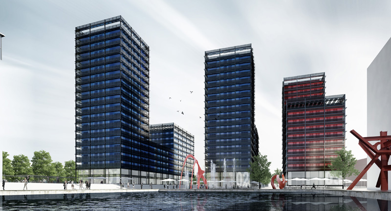 Développer un ensemble immobilier mixte combinant espaces de bureaux et logements, organisé autour de trois tours et capable d’accueillir différentes fonctions au sein d’un même programme.